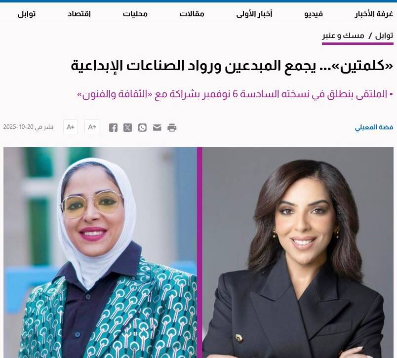 النسخة السادسة من ملتقى “كلمتين” تؤكد دور الإبداع في تنمية المجتمع ودعم الاقتصاد الوطني MediaNovember 12, 20250Views0Likes0CommentsRead More